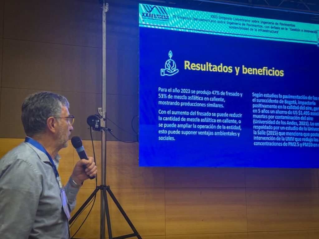 La primera ponencia, titulada “La Revolución del Fresado Estabilizado y su Aprovechamiento como Alternativa para el Cumplimiento de las Políticas Sociales Nacionales y Distritales en Colombia”, fue presentada por el director de la UMV, Álvaro Sandoval Reyes. La segunda intervención, a cargo del ingeniero Franceth Castellanos Ballesteros, abordó la “Evaluación de Mezclas Asfálticas Modificadas con Plásticos de un Solo Uso”, un proyecto orientado a la implementación de soluciones sostenibles en pavimentación. El Ingeniero Humberto Ramírez Gómez, fue pieza clave en el desarrollo de ambos proyectos quien también acompañó las actividades técnicas en los simposios.