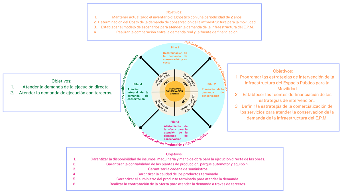 El modelo de conservación de la entidad está sustentado en 4 pilares técnicos que reconocen la misionalidad y la estructura organizacional de la misma. Este modelo consta de 4 instrumentos para su implementación, uno de ejecución, representando por el plan de desarrollo distrital en cada una de sus vigencias, otro, el instrumento territorial, asociado al Plan de Ordenamiento Territorial, otro, el instrumento de coordinación, asociado a la Sala Coordinadora de Obras y finalmente un instrumento de gestión, representado por las políticas púbicas en las que participa la entidad. El modelo se observa en la siguiente gráfica.